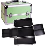Green Makeup Travel Case. High quality aluminum finish and construction with reinforced steel corners for extra durability Beautiful new green stripe aluminum finish with silver aluminum trimming 2 extendable trays with spacious interior with dividers Large center storage compartment Heavy duty handle for added comfort and grip Easy to clean interior 2 secure easy close latches with key locks Large tray dimension (LxWxH): 7.25" x 6.25" x 3.25" 2 medium trays dimensions (LxWxH): 7.25" x 6.25" x 1.5" Large center compartment dimension (LxWxH): 13.75" x 8.5" x 5.25"